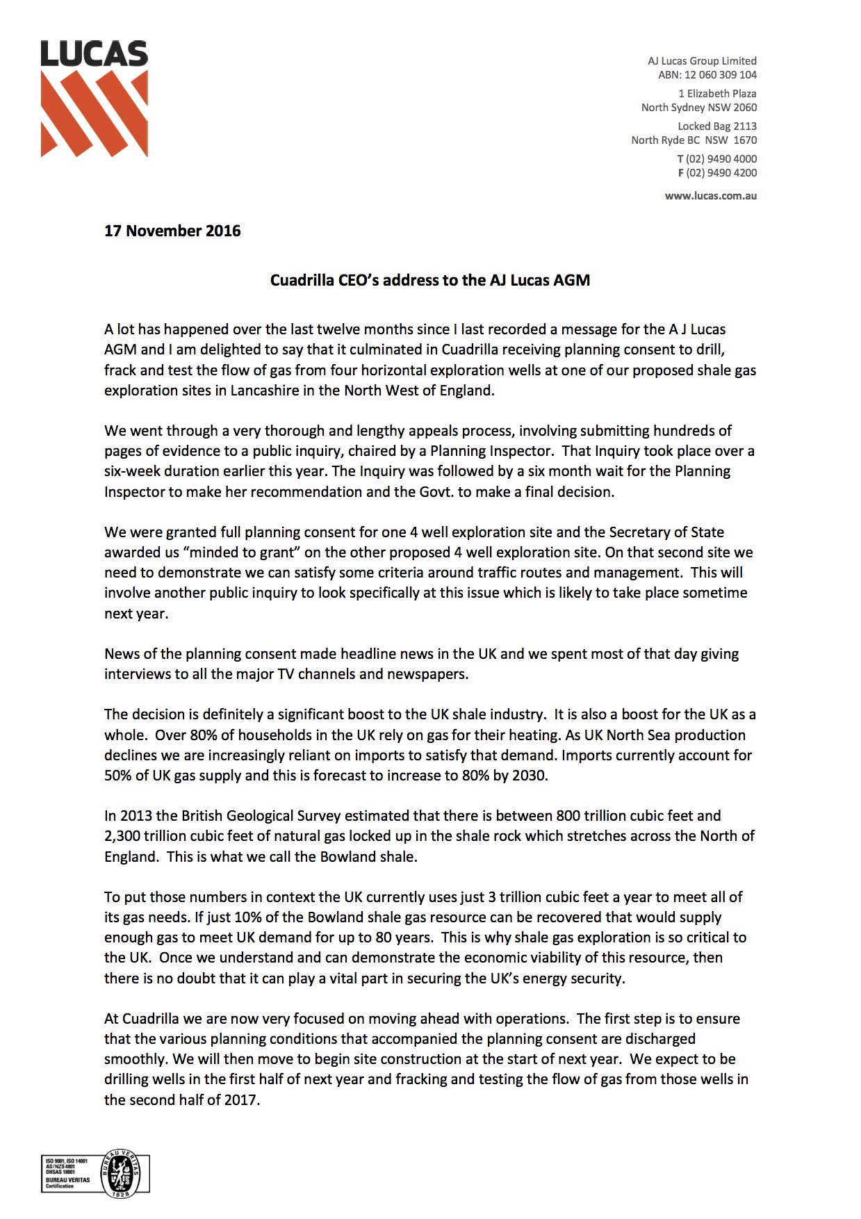Cuadrilla CEO addresses AJ Lucas shareholders